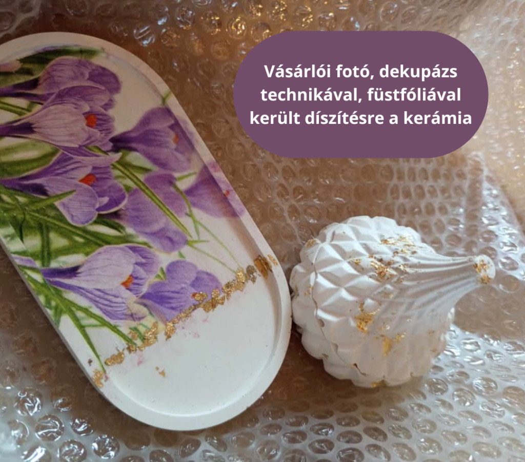 Száradás után szalvétatechnikával, metálfóliával, akrilfestékkel, ragasztással díszíthetők, lakkozható.